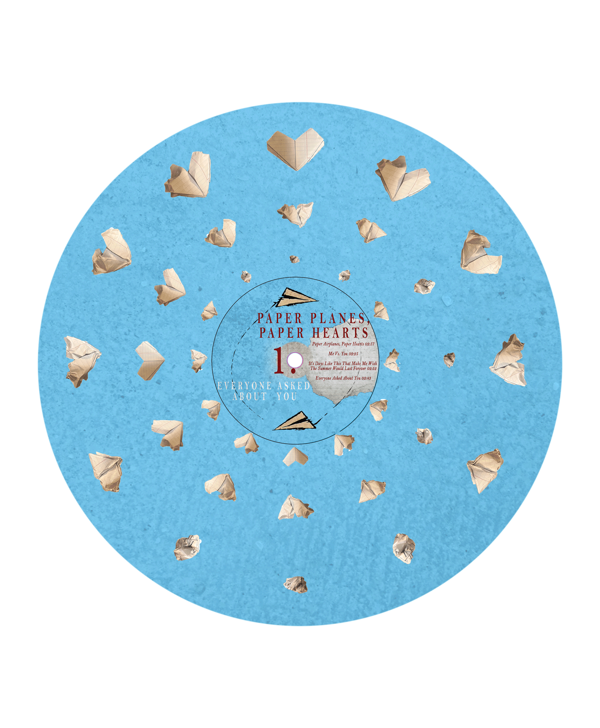 For the vinyl album cover I recreated the cover for the album “Paper Planes, Paper Hearts” by the band Everyone Asked About You. This album portrays young love gone wrong, and the substance and sexual abuse that came along with the heartbreak. I conveyed the young love aspect of the album by using primary color, which people tend to associate with being a kid. I also used a paper airplane and a paper heart to symbolize the fickle and frail nature of the young relationship and how fast it can crumple onto you. The characters on the front of the cover show someone taking control, sexually and mentally through the use of a figure only holding the head of another person b y the neck. The serif typeface allows the album to be legible and maintain an adult atmosphere surrounding the childish love being portrayed in the album. The contrast of the rough drawings and texture with the stagnant serif font encompass the childish, yet serious nature of the album and its contents.